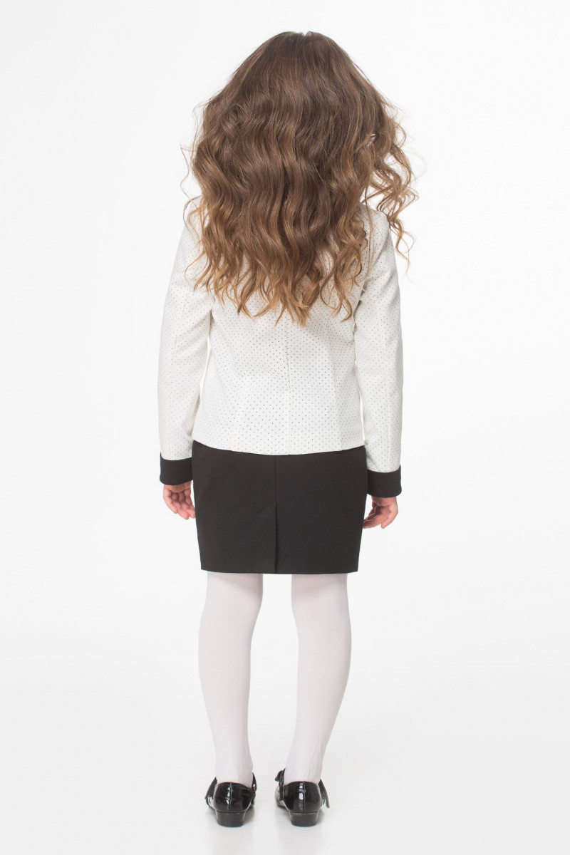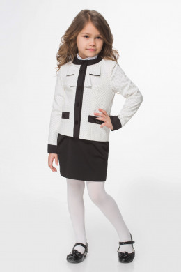 Строгий жакет для девочки из трикотажного полотна. Жакет полуприлегающего силуэта, с центральной застежкой на петли и пуговицы. По бокам карманы. Жакет дополнен декоративным бантом по горловине. Жакет имеет съёмные манжеты. Жакет отлично сочетается с различными брюками и юбками, создавая модный современный образ школьника.