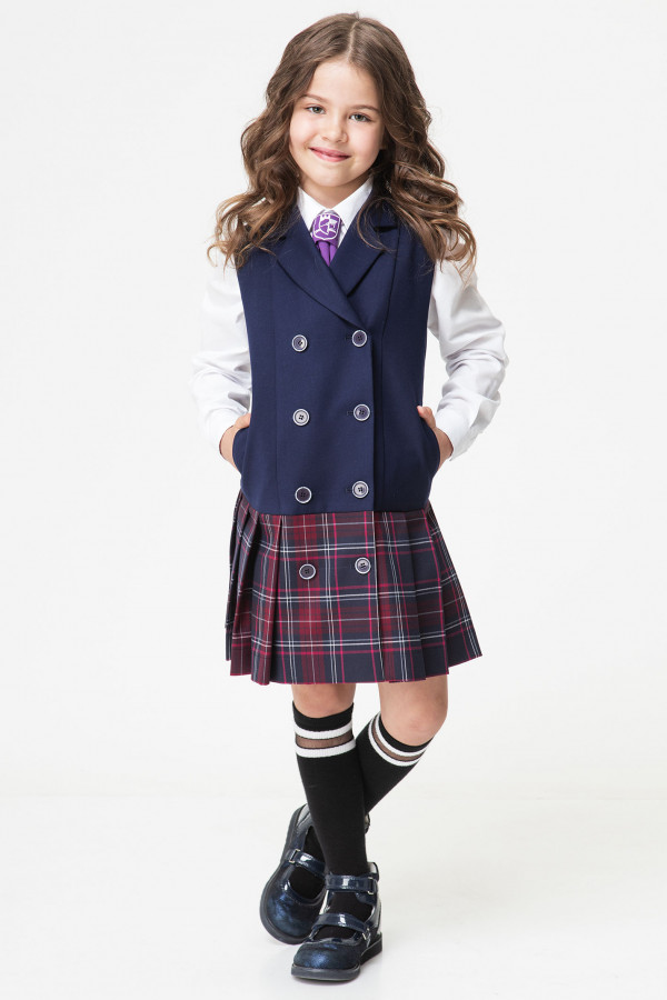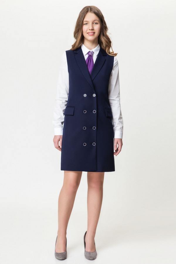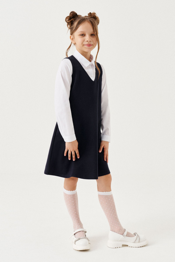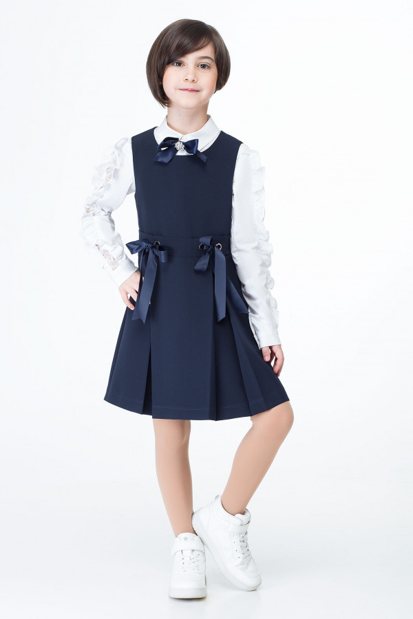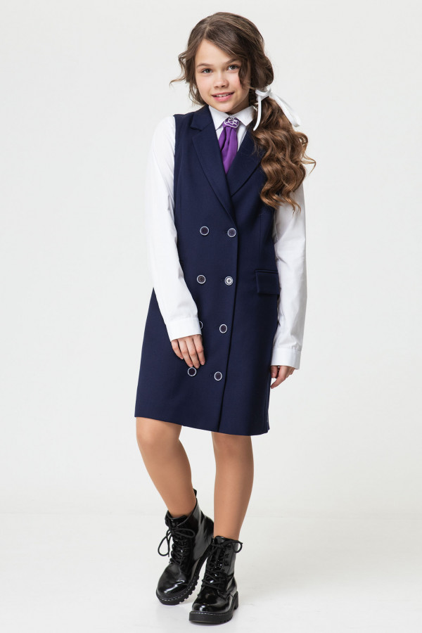 Сарафан для девочки, с V- образным вырезом горловины, с рукавами "крылышко", отрезное ниже линии груди, с двубортной застежкой на петли и пуговицы и потайной тесьмой-молнией в среднем шве спинки.
