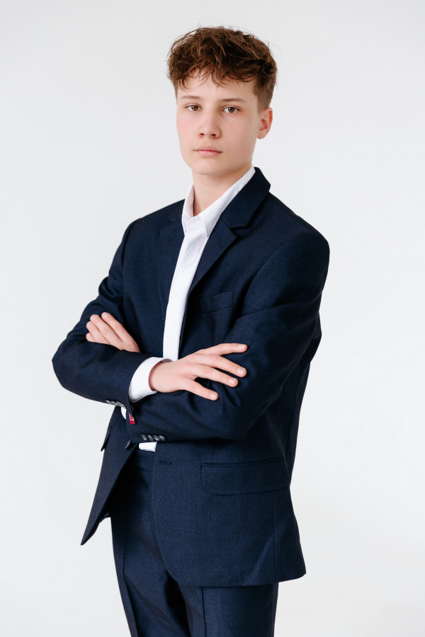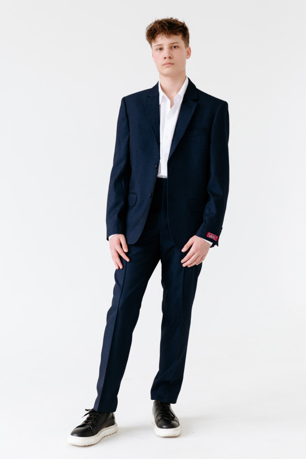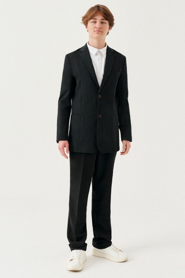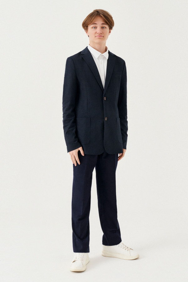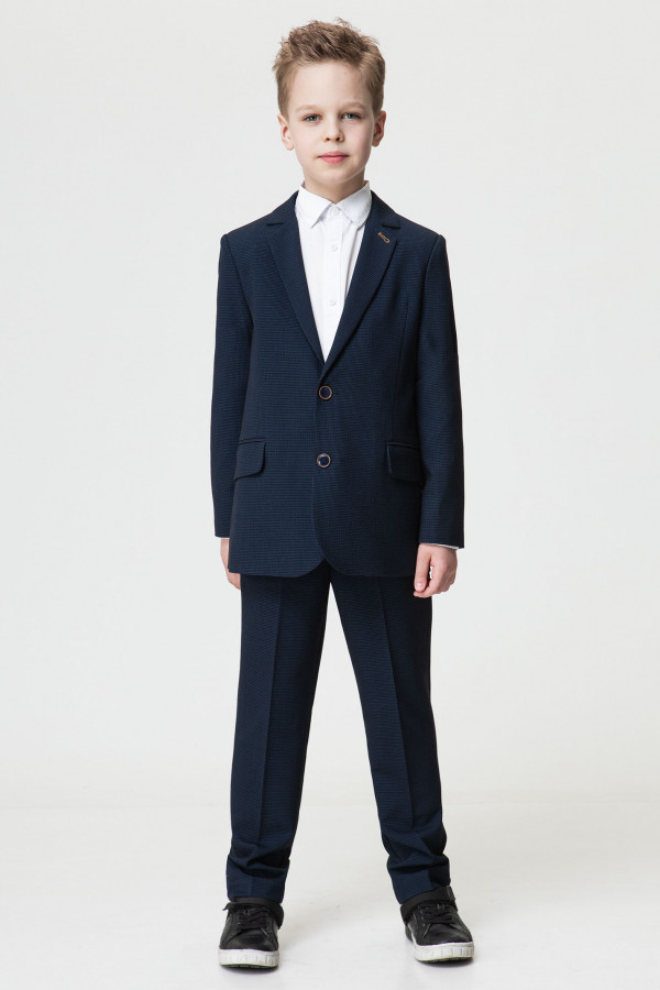 Пиджак для мальчика полуприлегающего силуэта с центральной застежкой на две петли и пуговицы, с V-образным вырезом горловины, с втачными рукавами.
