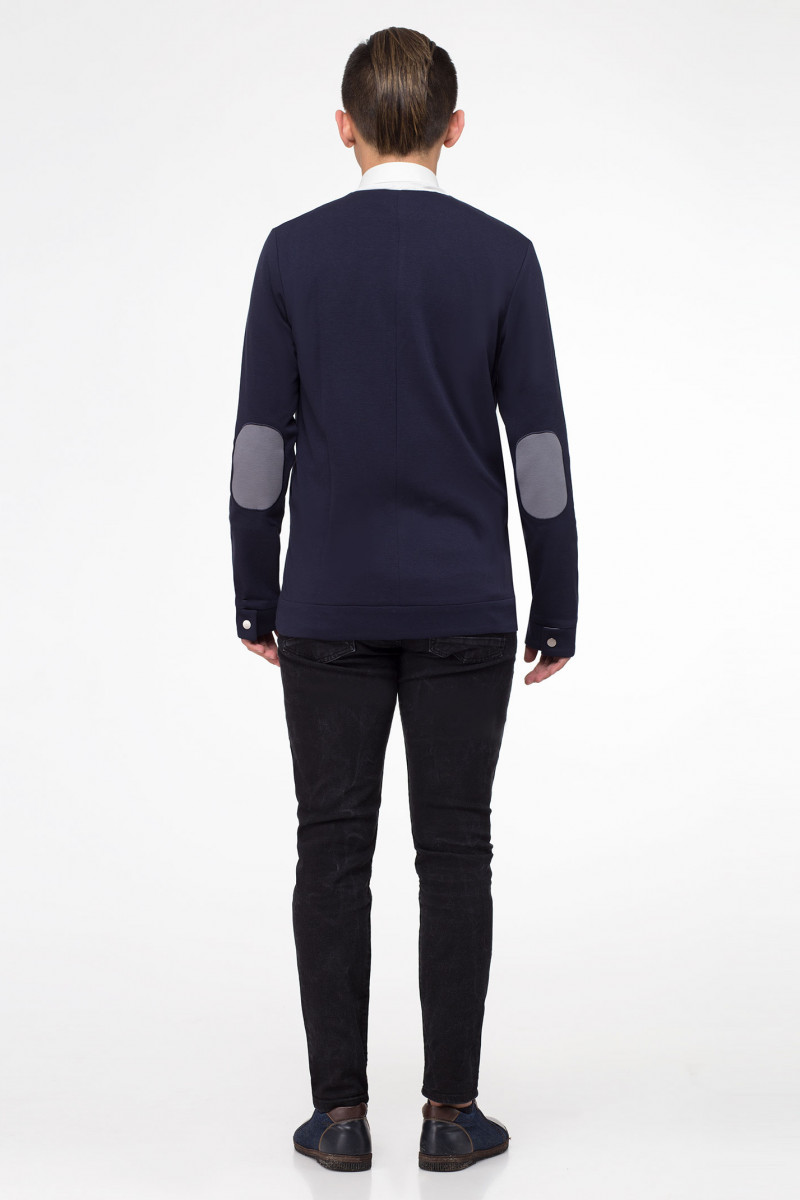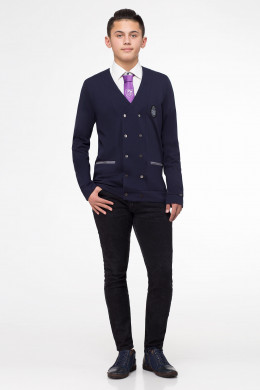 Кардиган для мальчика полуприлегающего силуэта с двубортной застежкой на кнопки, с V-образным вырезом горловины, с втачными рукавами, низ кардигана на притачной манжете.