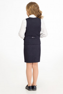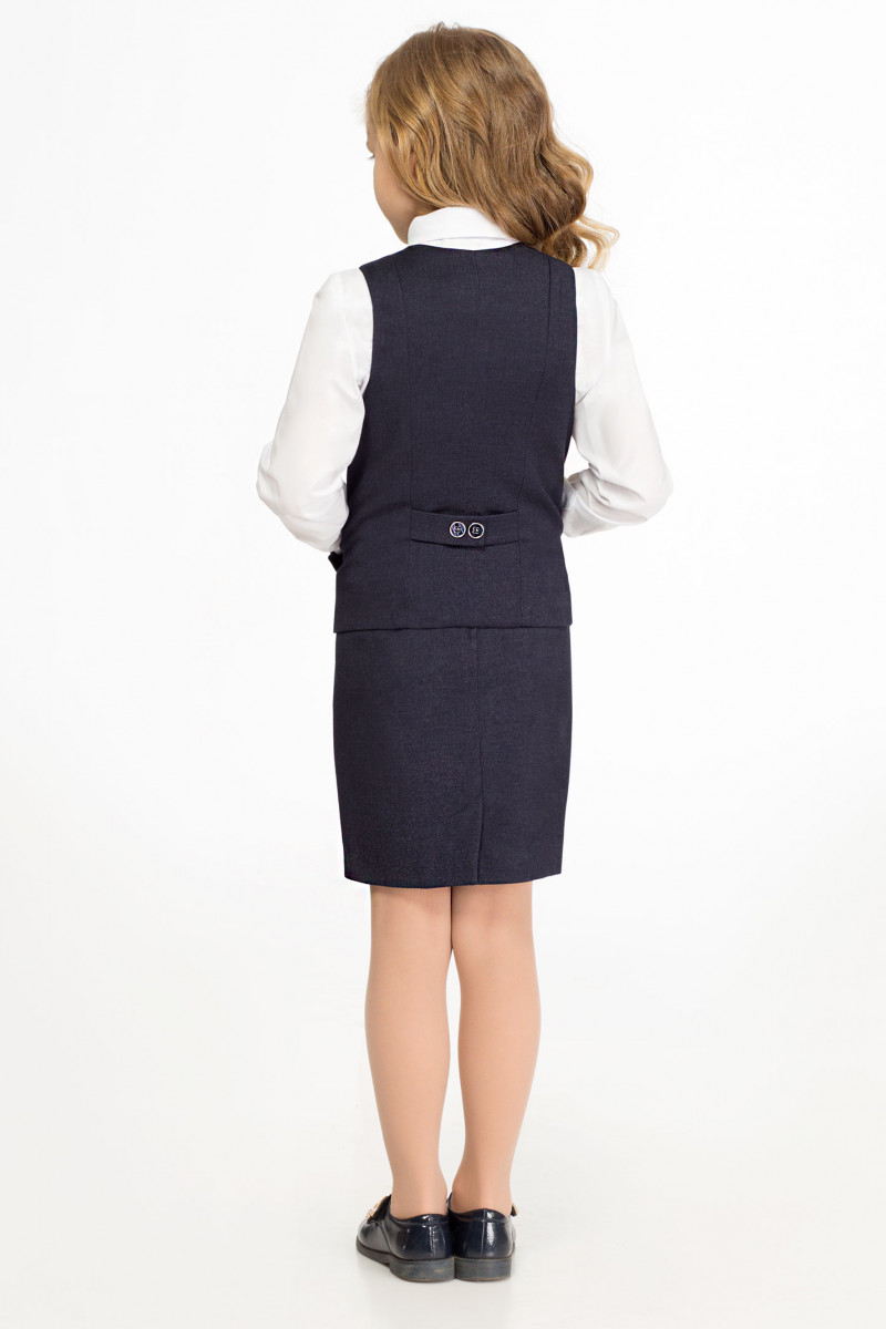 Жилет для девочки полуприлегающего силуэта с двубортной застежкой на петли и пуговицы, с V-образным вырезом горловины.
