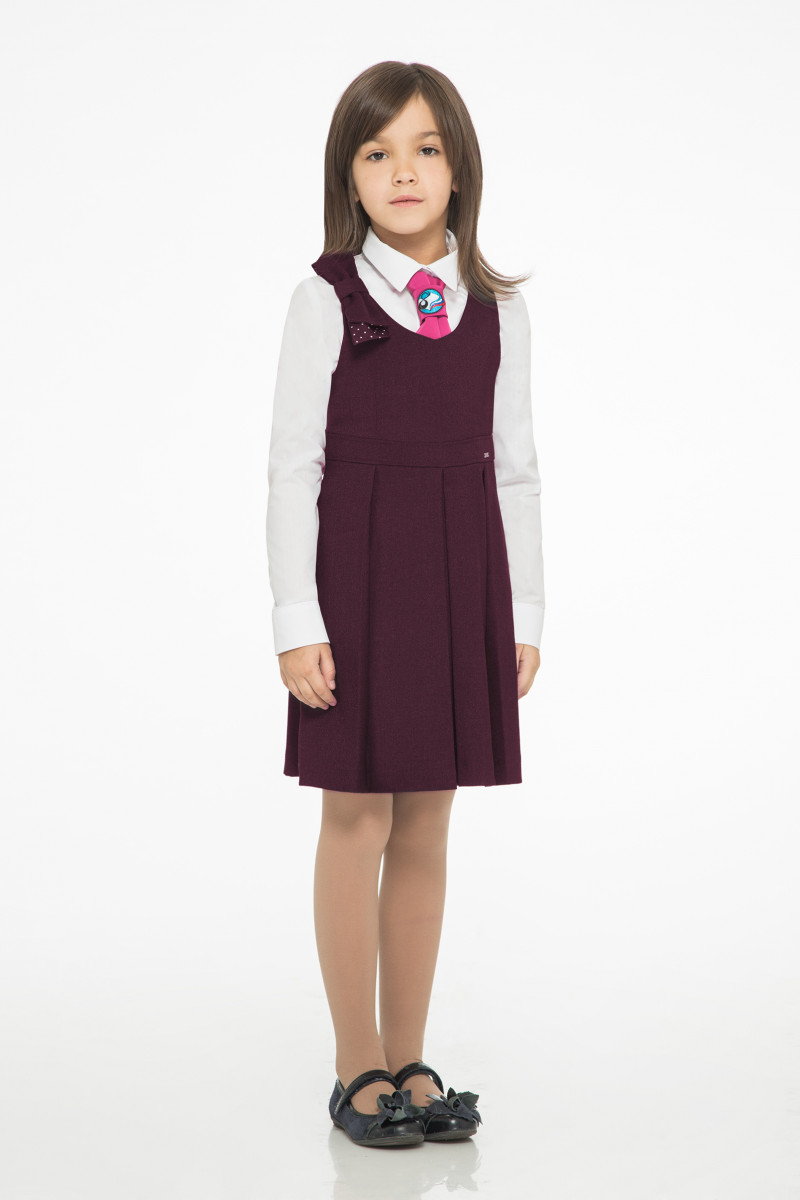 Сарафан для девочки полуприлегающего силуэта, отрезной по талии, со встречными складками по юбки сарафана.Передняя часть с рельефными швами, идущими от проймы до подреза по талии. С правой стороны декоративный бант. Спинка со средним швом и с застежкой на тесьму-молнию. По спинке рельефные швы, идущие от проймы до подреза по талии. Сарафан без подкладки.