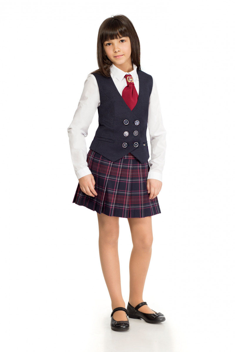 Юбка для девочки на талии, с широкой кокеткой со шлевками, с застежкой на тесьму-молнию в боковом шве, длиной до коленей.