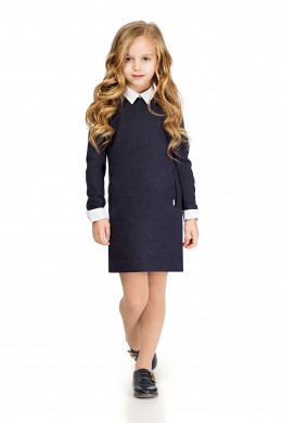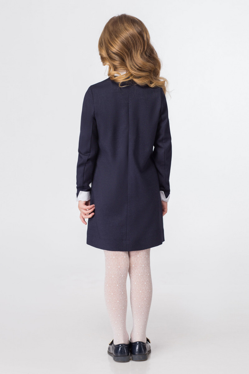 Платье для девочки полуприлегающего силуэта, с длинным втачным рукавом, со съемным воротничком и манжетами, с застежкой на потайную молнию по спинке. По переду платья имеются боковые карманы. Спинка со средним швом. Воротничок и манжеты съемные на потайных петлях и пуговицах, что обеспечивает практичность. Передняя часть платья на вискозной подкладки.