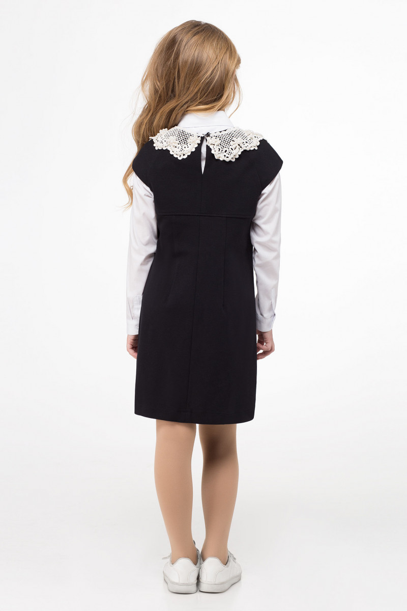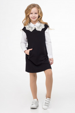 Строгое лаконичное детское платье из трикотажного полотна. Платье прямого силуэта, по переду карманы. Платье декорировано кружевным нарядным воротничком по горловине. Отличный вариант для школьных будней.