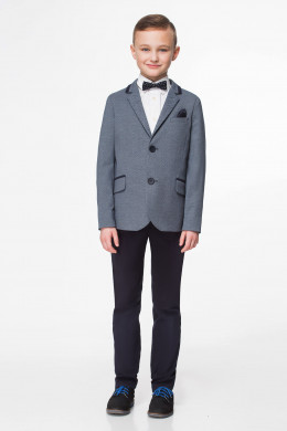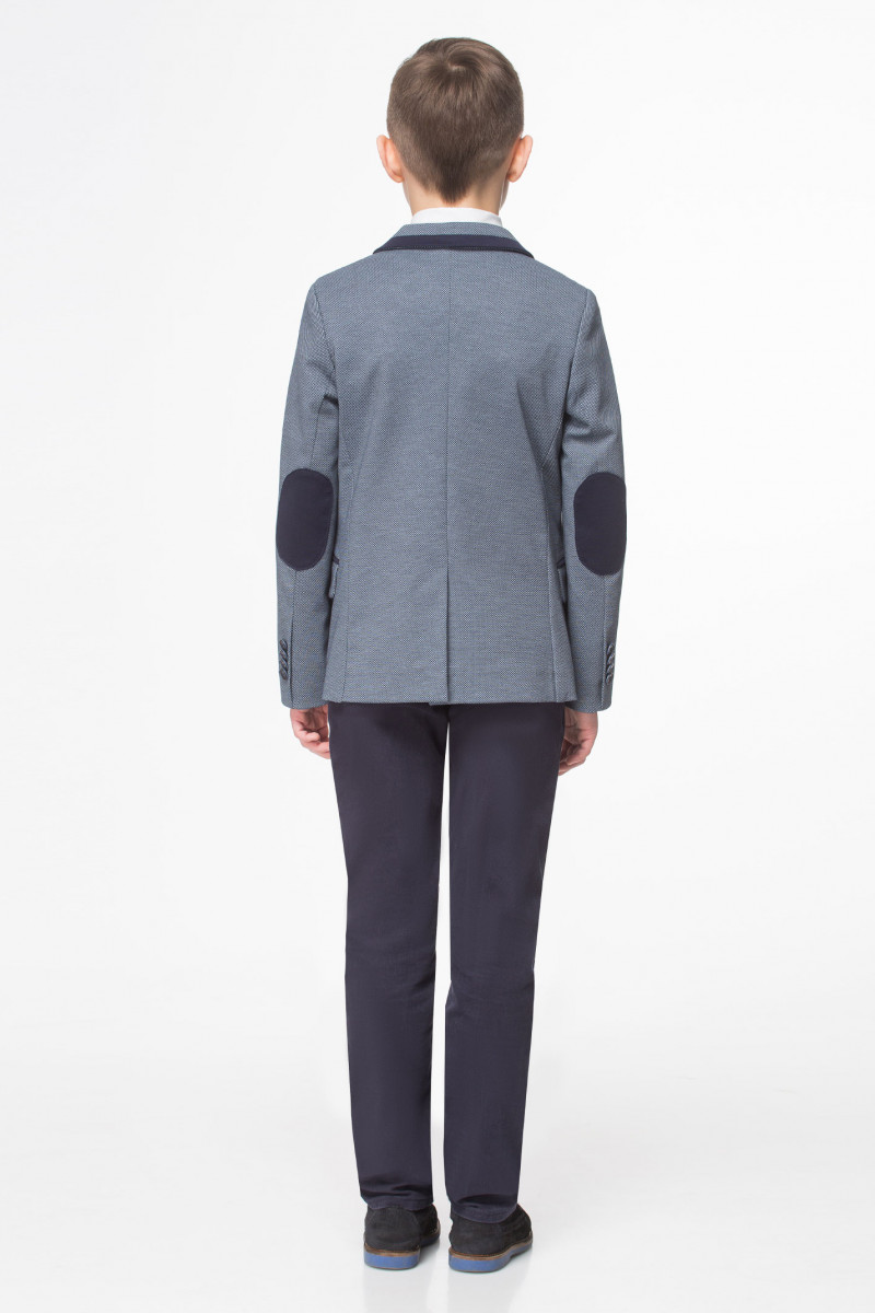 Строгий пиджак для мальчика из трикотажного полотна с мелким геометрическим рисунком на вискозной подкладки.