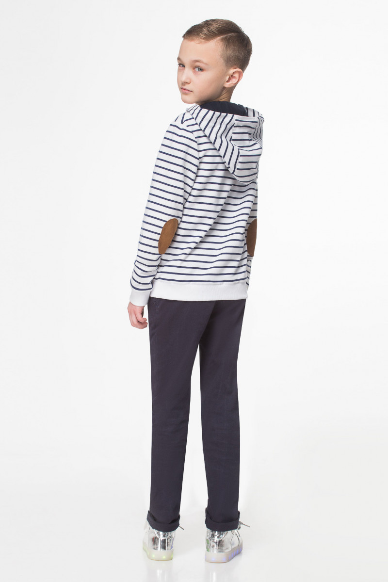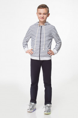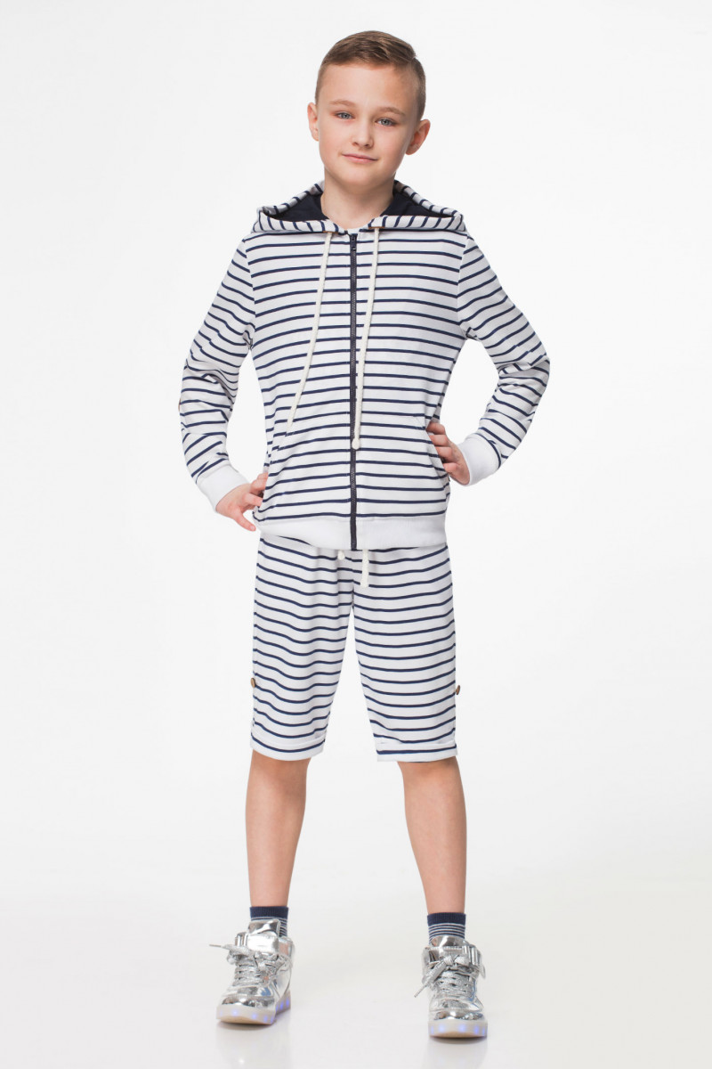 Стильный жакет для мальчика из трикотажного полотна с рисунком в полоску. Жакет с длинными рукавами, с капюшоном, с центральной застёжкой на молнию. Жакет дополнен двумя карманами по переду, налокотниками на рукавах, широкой манжетой по низу рукавов и переда. Такой жакет отлично подойдет для каждодневной носки.