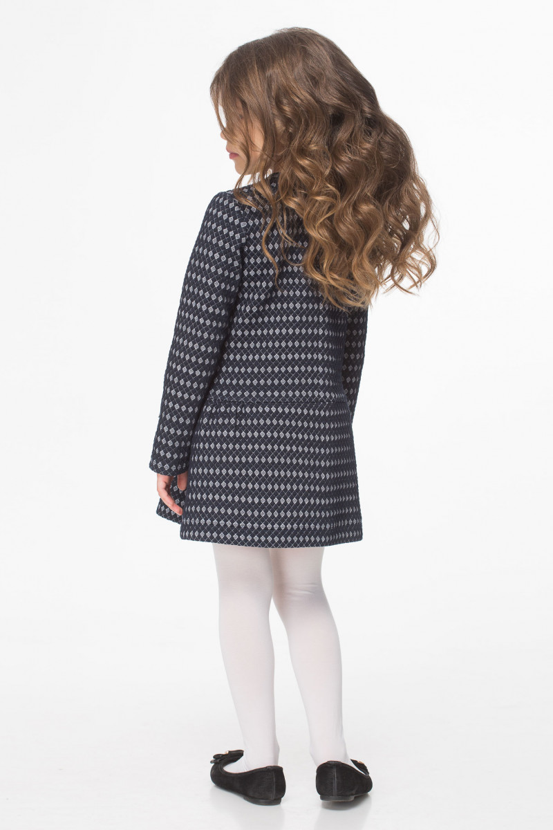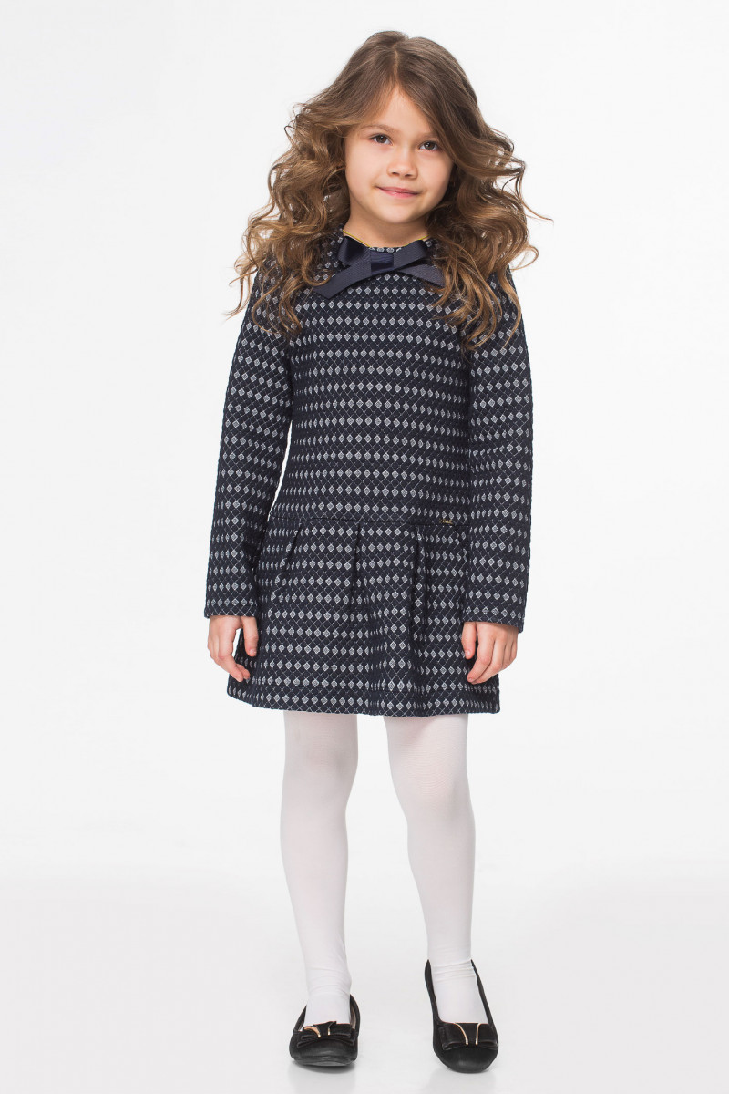 Превосходное платье для девочки младшего школьного возраста из трикотажного жаккардового полотна с геометрическим рисунком. Платье с длинным рукавом, с круглым вырезом горловины, с боковыми карманами. Платье дополнено по горловине бантом. Отличный повседневный вариант.