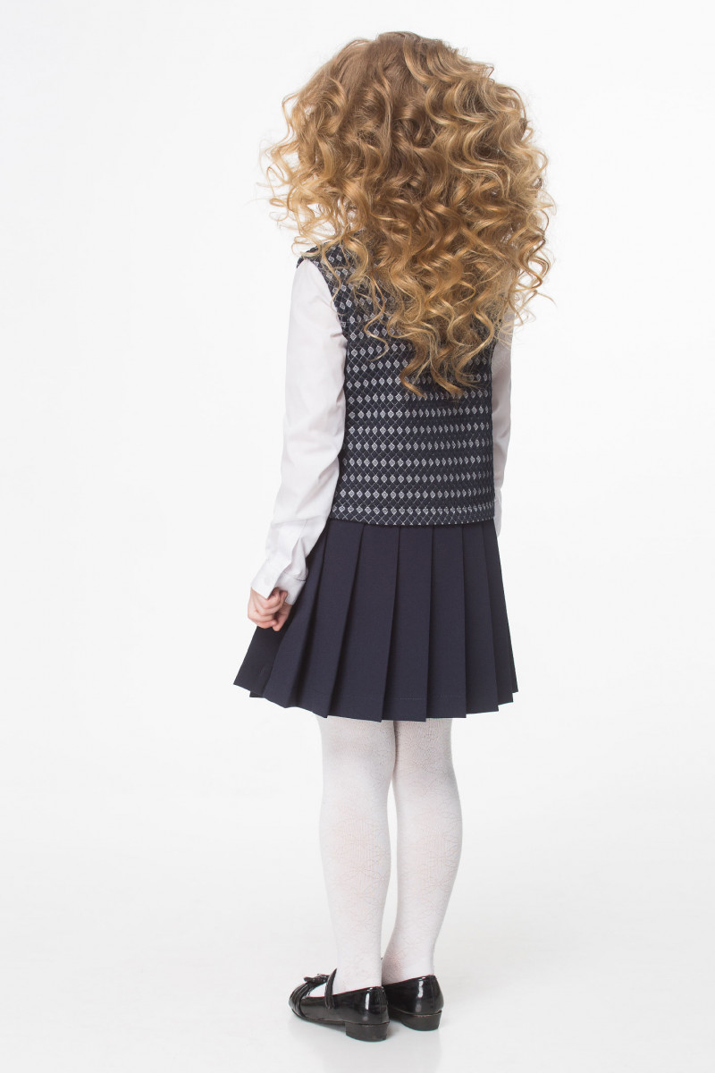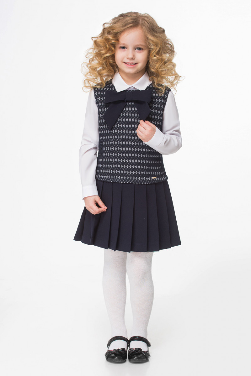 Стильный сарафан из трикотажного жаккардового полотна с геометрическим сине белым рисунком. Сарафан полуприлегающего силуэта, низ сарафана выполнен из текстиля в складку. По горловине сарафан дополняет большой бант. Такой сарафан отлично сочетается с блузками или водолазками. Комфортный и беспроигрышный вариант для школы.