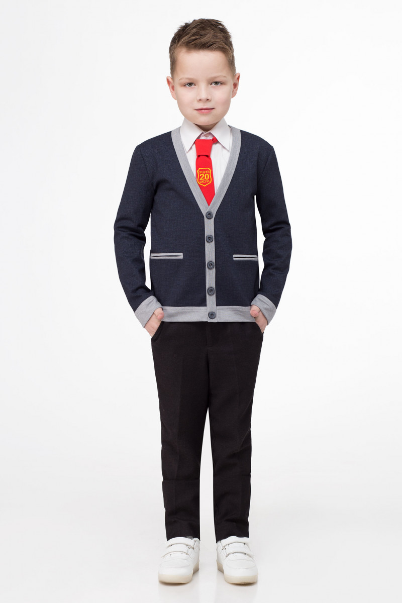 Строгий кардиган для мальчика младшего школьного возраста из трикотажного полотна. Кардиган полуприлегающего силуэта со сквозной застежкой на планку на петли и пуговицы.По низу кардигана и по низу рукавов притачная манжета. Рукава длинные одношовные. На локтях настрочные налокотники. По переду прорезные карманы в рамку.