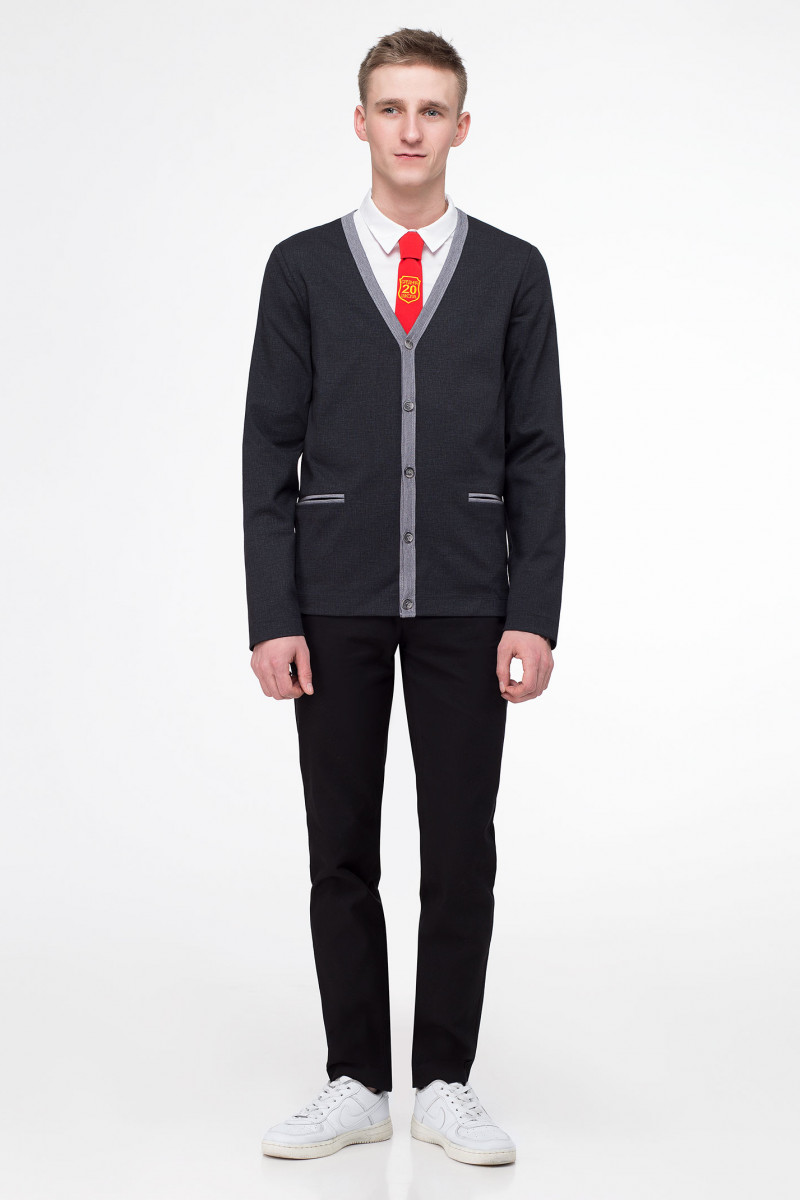 Строгий кардиган для мальчика старшего школьного возраста из трикотажного полотна. Кардиган полуприлегающего силуэта со сквозной застежкой на планку на петли и пуговицы. Рукава длинные одношовные. На локтях настрочные налокотники. По переду прорезные карманы в рамку.