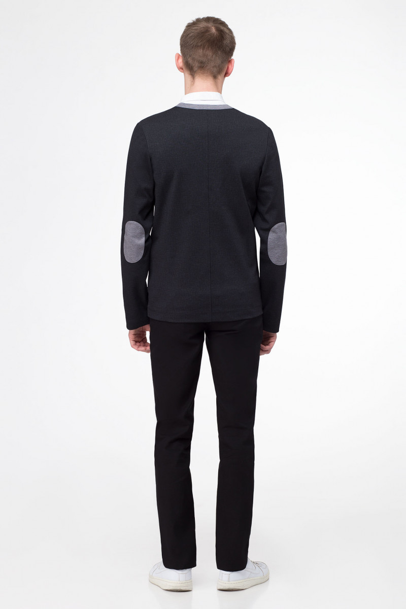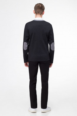 Строгий кардиган для мальчика подростковой возрастной группы из трикотажного полотна. Кардиган полуприлегающего силуэта со сквозной застежкой на планку на петли и пуговицы. Рукава длинные одношовные. На локтях настрочные налокотники. По переду прорезные карманы в рамку.