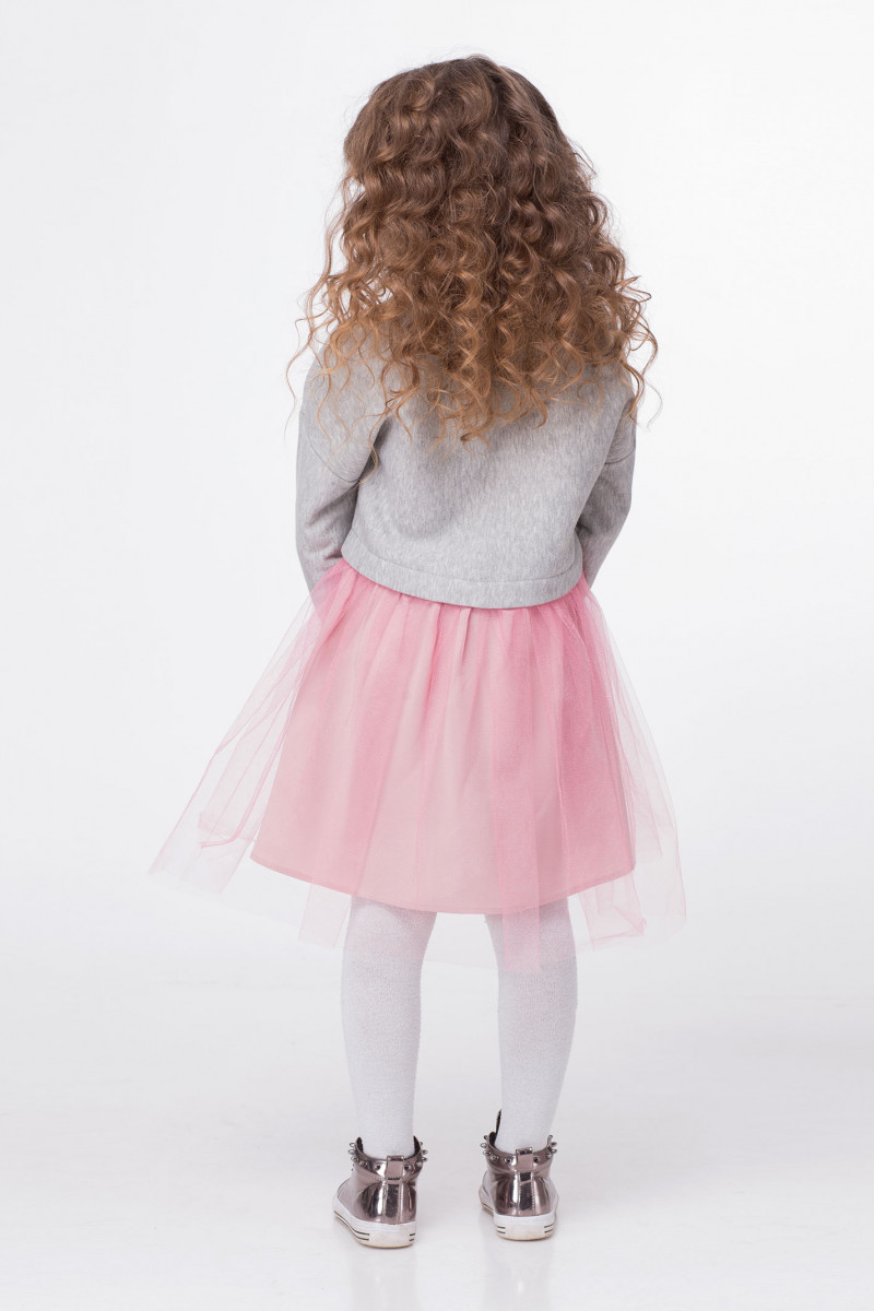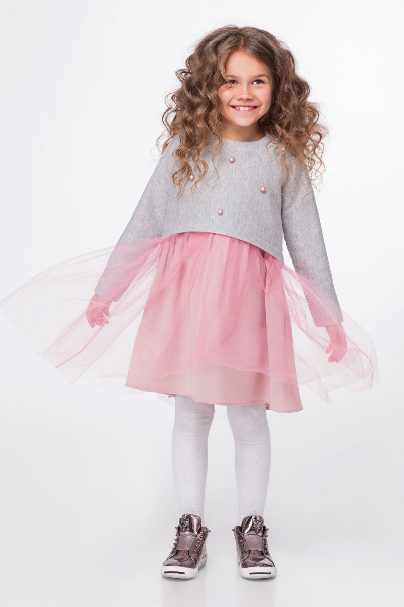 Нарядное платье для девочки из теплого трикотажного полотна с небольшим блеском в сочетании с легким воздушным фатином, который создает неповторимый воздушный образ.Такое платье будет отличным вариантом и для торжественных мероприятий и для повседневных дней. Платье свободное, отрезное по линии талии, с застежкой на петли и пуговицы по спинки. Рукава длинные. По переду платье декорировано жемчужными пришивными бусинками.