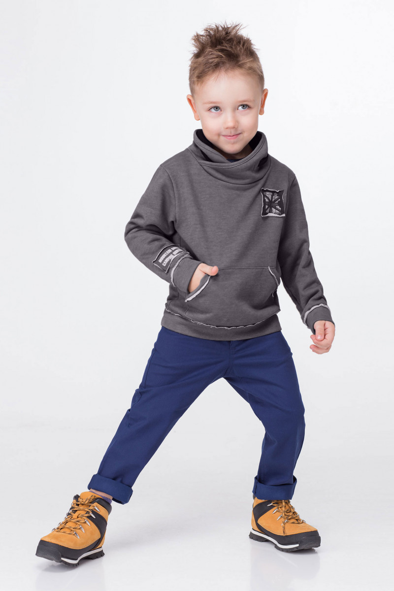 Стильный джемпер для мальчика из хлопкового трикотажного полотна. Джемпер с длинными рукавами, с высоким воротником со шнурами, с большим накладным карманам по переду. Джемпер дополнен широкой манжетой по низу рукавов и переда. Джемпер декорирован модными нашивками по переду и рукаву. Такой джемпер отлично подойдет для ежедневной носки.