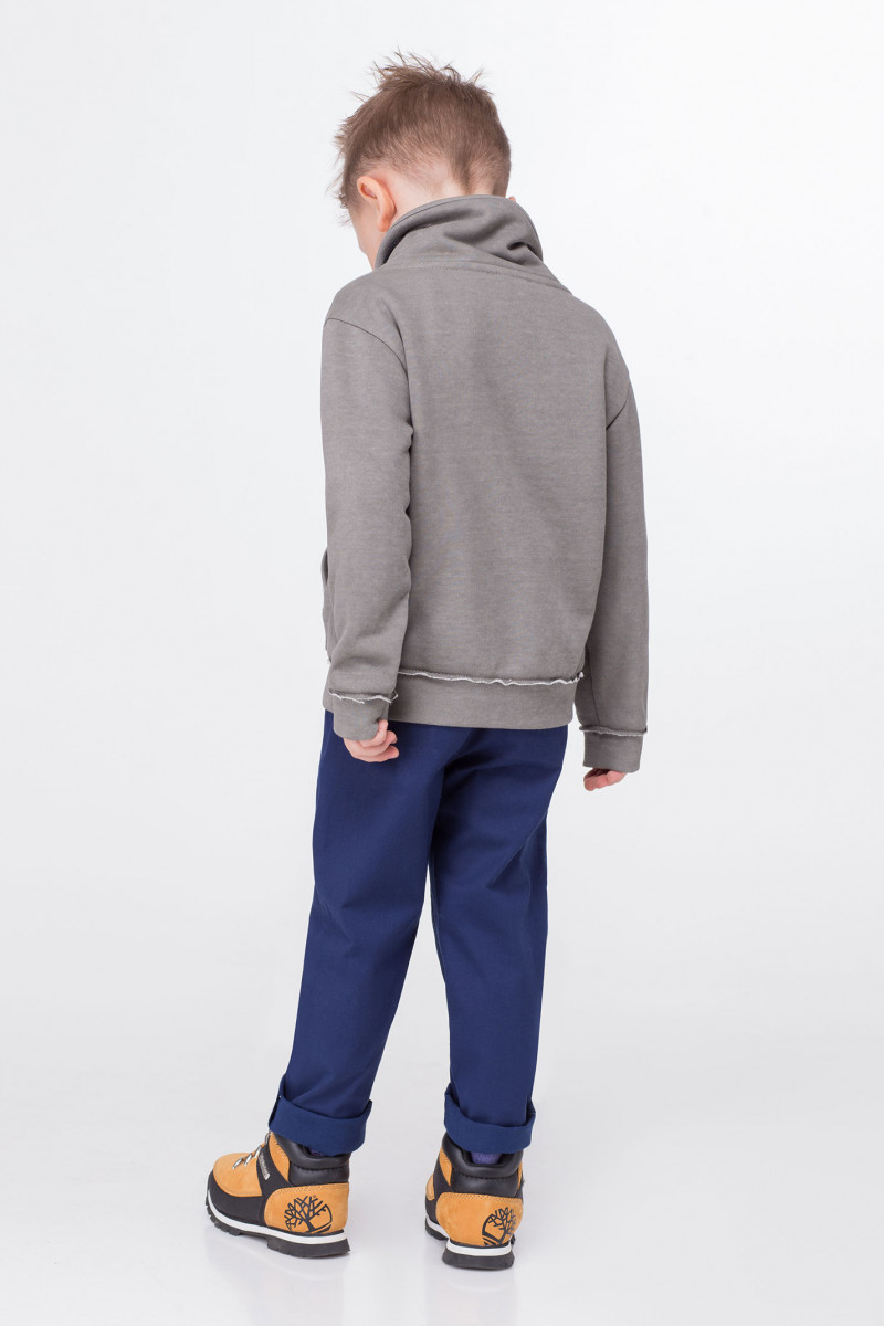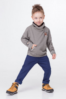 Стильный джемпер для мальчика из хлопкового трикотажного полотна. Джемпер с длинными рукавами, с высоким воротником со шнурами, с большим накладным карманам по переду. Джемпер дополнен широкой манжетой по низу рукавов и переда. Джемпер декорирован модными нашивками по переду и рукаву. Такой джемпер отлично подойдет для ежедневной носки.