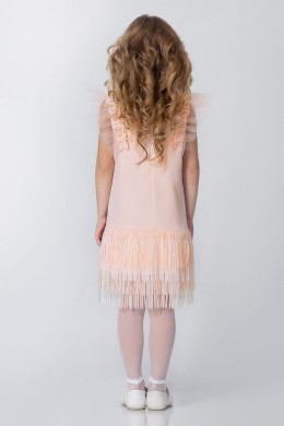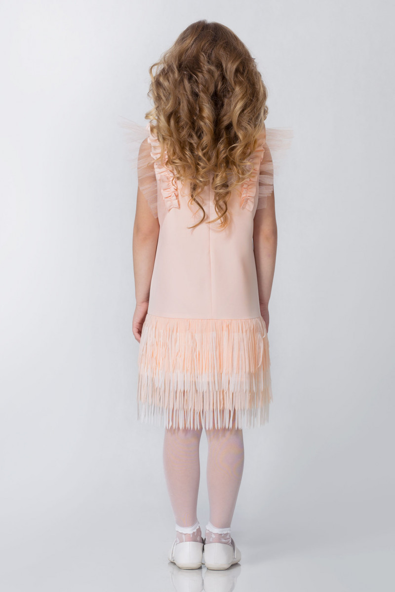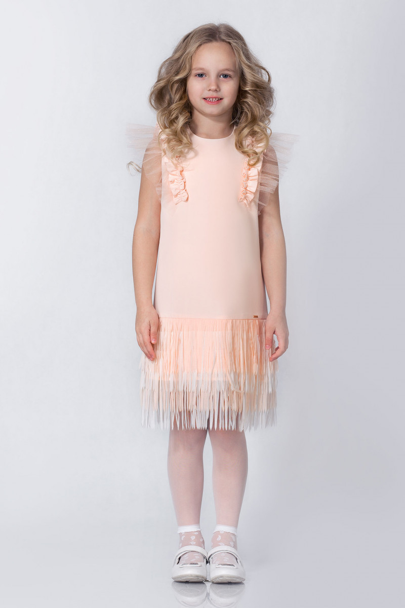 Нарядное платье для девочки модного нежного цвета. Платье на хлопковой подкладки. Платье полуприлегающего силуэта, с круглым вырезом горловины, с эффектными рукавами из фатина. Платье отрезное по низу. Нижняя часть платья из изящной ткани с бахромой. Отличный вариант для торжественных случаев.