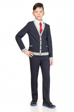 Классические брюки для мальчика из поливискозной костюмной ткани. Брюки на талии, прямого силуэта, с притачным поясом. Брюки с застежкой на одну петлю и пуговицу на поясе, и тесьму-молнию по переду. По поясу расположены шлевки.