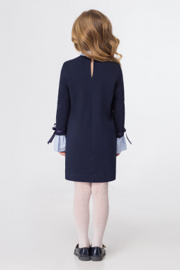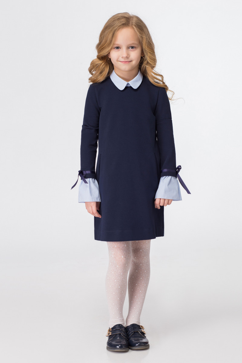Стильное платье для девочки из хлопкового трикотажного полотна с отделкой из хлопковой ткани с рисунком в полоску. Платье полуприлегающего силуэта, с сорочечным воротником, с карманами по переду, с застежкой на петлю и пуговицу на воротнике. Рукава втачные длинные, по низу притачен манжет из хлопковой ткани с рисунком в полоску. Над манжетам настрочена атласная лента, которая завязывается в декоративный бантик. Комфортное платье станет прекрасным выбором школьника.