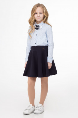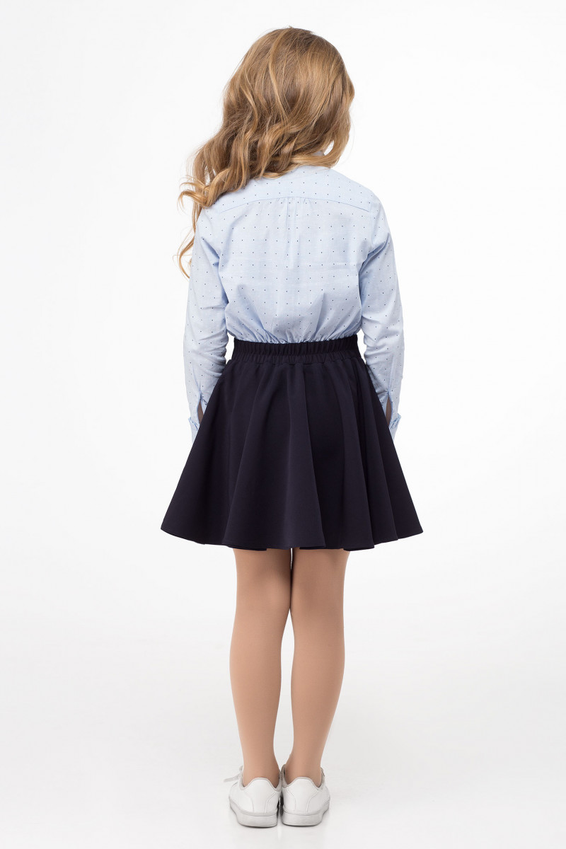 Платье для девочки имитирующее блузку с юбкой. Верхняя часть платья из смесовой сорочечной ткани с рисунком. По переду сквозная застежка на петли и пуговицы, воротник сорочечный. Рукава длинные на притачной манжете с петлей и пуговицей. В шов притачивания манжеты вставлена небольшая рюша. Нижняя часть платья юбка формы солнца, со складками по переду. По спинки по талии резинка. Платье дополнено съёмной брошкой бант по горловине.