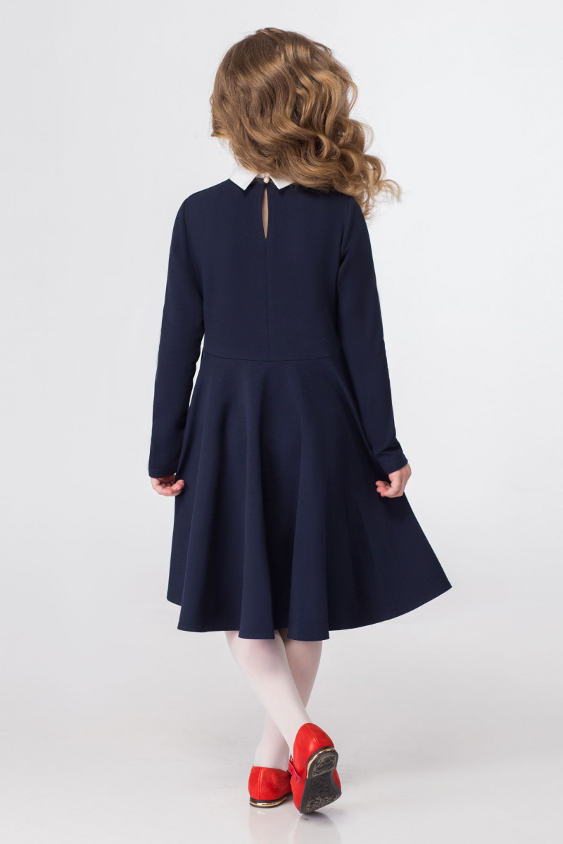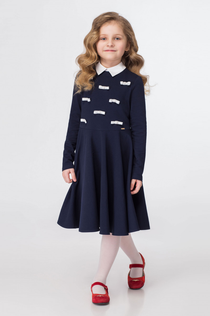 Школьное платье для девочки выполнено из хлопкового трикотажного полотна. Платье со съёмным белым воротничком. Платье отрезное по талии, юбка платье полу солнце. Рукава длинные одношовные. Застежка на петлю и пуговицу по спинки. По переду платье украшено декоративными бантиками с жемчужными бусинками.