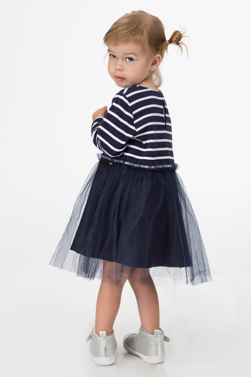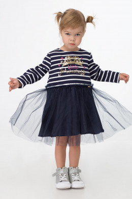 Нарядное платье для девочки выполнено из хлопкового трикотажного полотна с рисунком в полоску, низ платья накрыт мягкой сеткой. Платье с длинными рукавами, с круглым вырезом горловины, с застежкой на пуговицу по спинки. Платье украшено вышивкой с пайетками по переду. Отличный нарядный комфортный вариант для торжественных случаев.