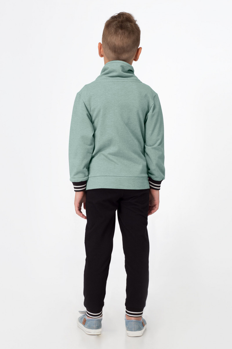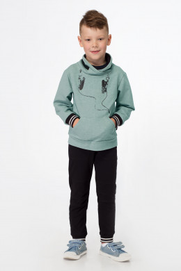 Стильный джемпер для мальчика из хлопкового трикотажного полотна. Джемпер с длинными рукавами, с высоким воротником со шнурами, с большим накладным карманам по переду. Джемпер дополнен широкой манжетой по низу рукавов и переда. Джемпер декорирован оригинальным рисунком по переду. Такой джемпер отлично подойдет для ежедневной носки.