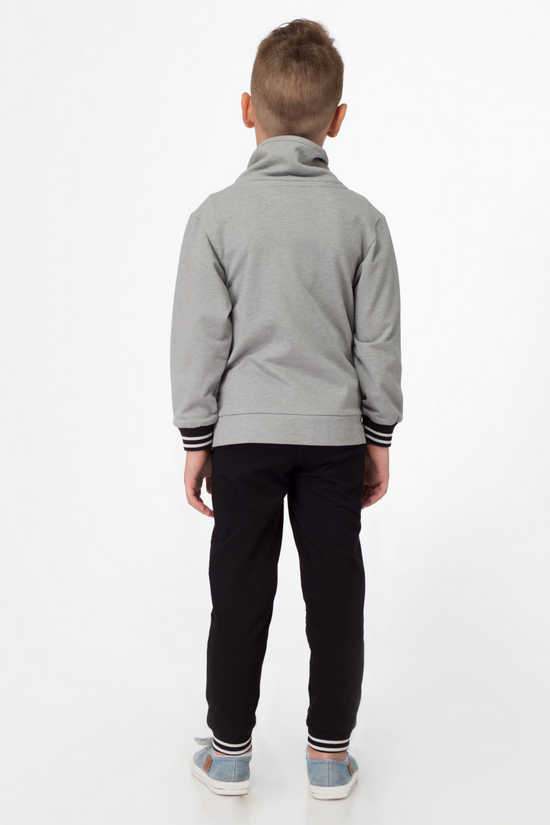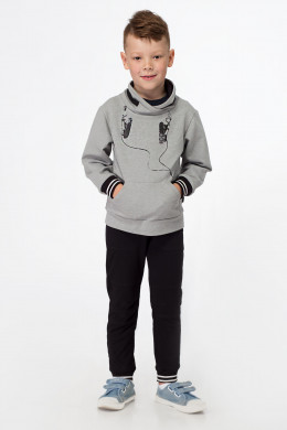 Стильный джемпер для мальчика из хлопкового трикотажного полотна. Джемпер с длинными рукавами, с высоким воротником со шнурами, с большим накладным карманам по переду. Джемпер дополнен широкой манжетой по низу рукавов и переда. Джемпер декорирован оригинальным рисунком по переду. Такой джемпер отлично подойдет для ежедневной носки.