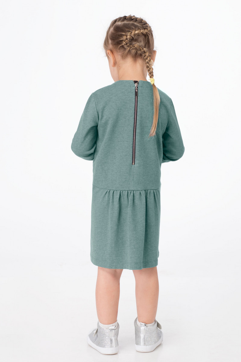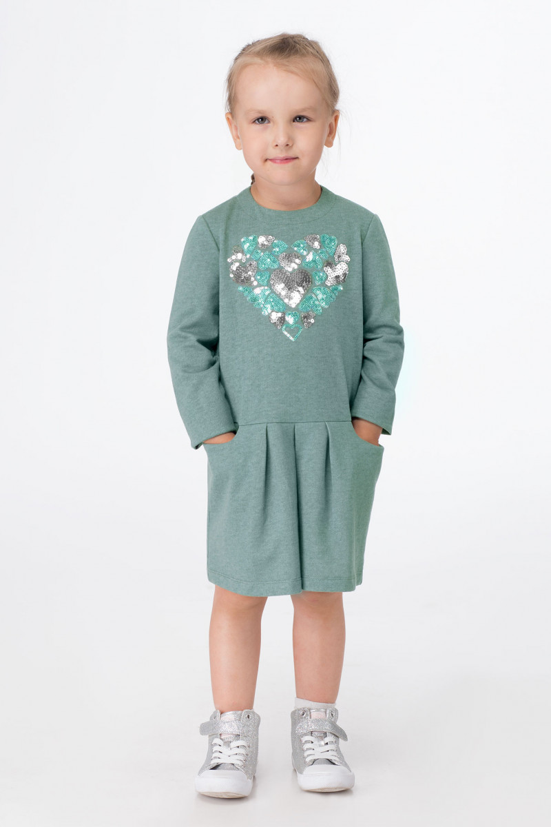 Платье для девочки из хлопкового трикотажного полотна. Платье с круглым вырезом горловины, с длинными рукавами, с декоративной застежкой на металлическую молнию по спинки. Платье отрезное по линии бедер, нижняя часть платья расширенная, по центру заложены складки, по бокам карманы. По переду платья выполнена яркая вышивка с блеском из пайеток, которая придает нарядность данной модели.