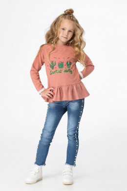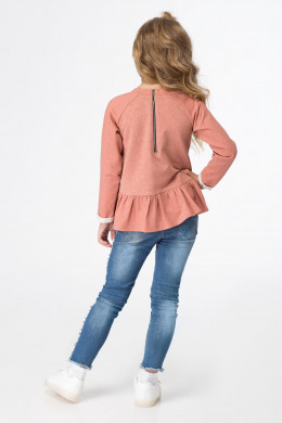 Джемпер для девочки из хлопкового трикотажного полотна с застежкой на тесьму-молнию по спинке. Джемпер свободного кроя, с притачной рюшей по низу. Рукава длинные, горловина круглая. По переду джемпер дополнен яркой вышивкой с пайетками.