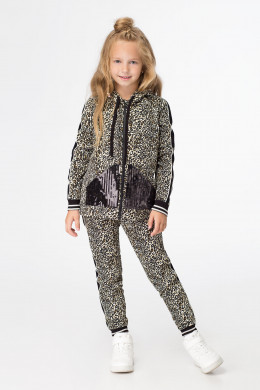 Стильные спортивный жакет для девочки из трикотажного полотна с ярким звериным рисунком.Жакет с застежкой на молнию по переду, с капюшоном, с большими накладными карманами, идущими от молнии по переду. Карманы расшиты пайетками, которые придают блеск и изящество данному жакету. Жакет с длинными рукавами, низ рукавов на притачной декоративной манжете. Жакет дополнен модными лампасами по рукавам.