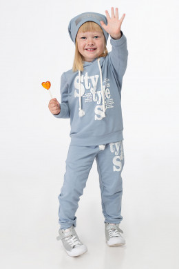 Стильный спортивный костюм, который состоит из брюк, джемпера и шапочки. Костюм выполнен из мягкого хлопкового трикотажного полотна. Брюки полуприлегающего силуэта, с боковыми карманами, на поясе на резинке. По низу притачные манжеты. В области коленей небольшая сборка, чтобы не вытягивались ткань в области колена. Слева нанесен рисунок. Джемпер с капюшоном, по низу рукавов и по низу изделия притачные манжеты, по переду нанесена печать. Шапка тоненькая с яркой печатью и стразами по переду. Шапка на тоненькой хлопковой подкладки.