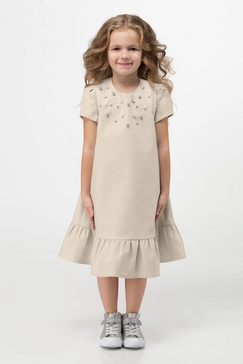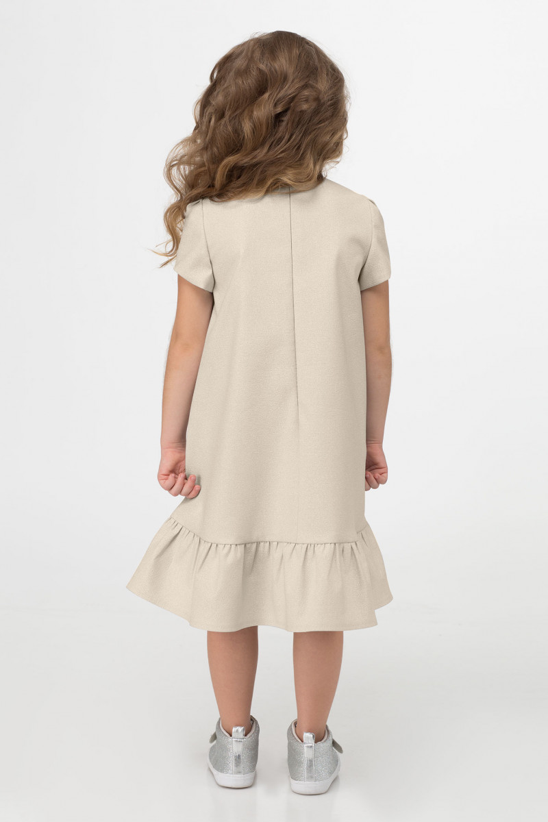Нарядное детское платье из плотной ткани с блеском. Платье на хлопковой подкладки. Платье расширенного силуэта, с рюшей по низу. Рукава короткие, по окату рукава бантовая складка, застежка на потайную молнию по спинке. В боковых швах имеются карманы. Платье декорировано жемчужными бусинками по переду.
