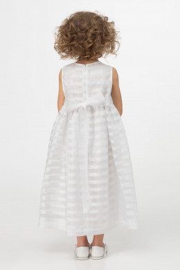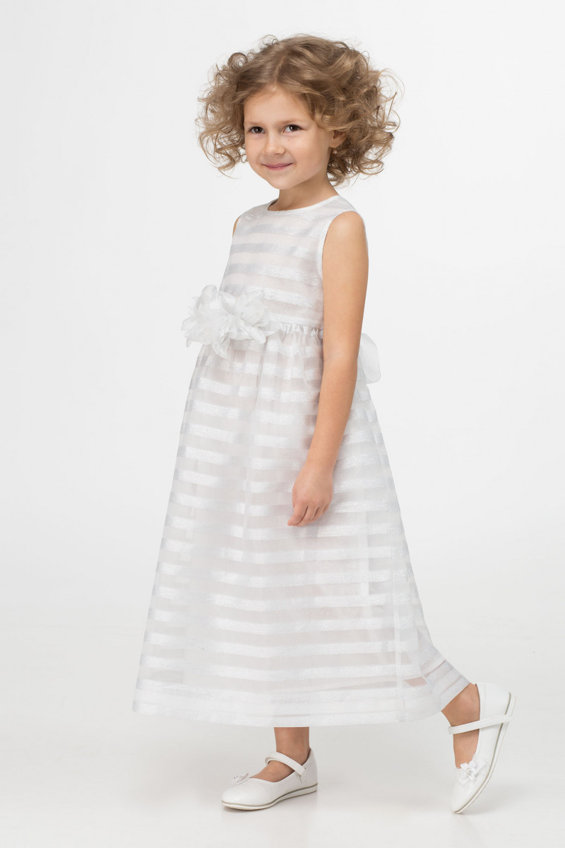 Нарядное платье для девочки. Платье выполнено из тонкой ткани с рисунком в полоску. Ткань с изящным блеском. Платье на хлопковой подкладки. Платье отрезное по талии, юбка платья со сборкой. Застежка на потайную молнию по спинки. Платье дополнено композицией из съёмных цветов.