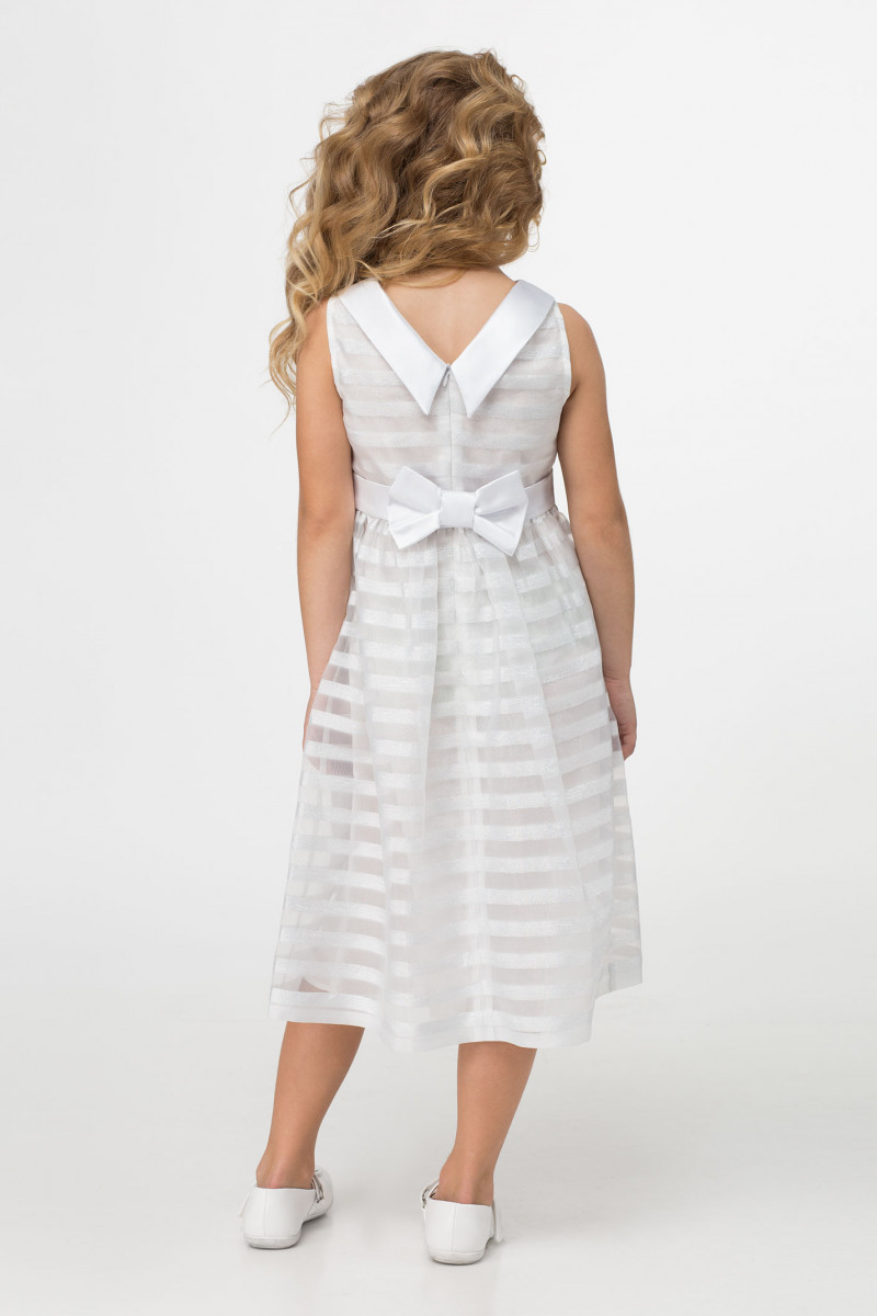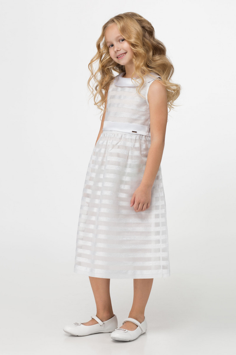 Нарядное платье для девочки. Платье выполнено из тонкой ткани с рисунком в полоску. Ткань с изящным блеском. Платье на хлопковой подкладки. Платье отрезное по талии, юбка платья со сборкой. Застежка на потайную молнию по спинки. Платье дополнено воротником и поясом из атласной ткани. На спинке съёмный бант.