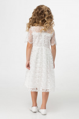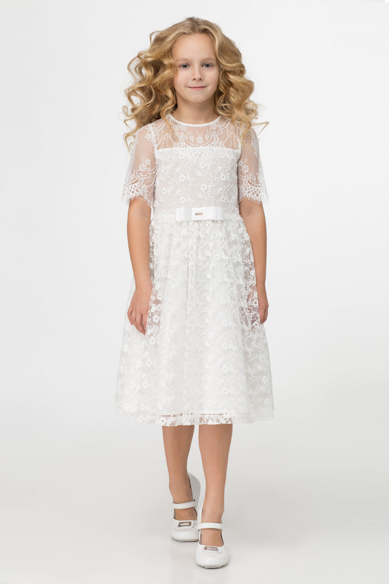 Нарядное стильное платье для девочки. Платье выполнено из тонкого кружева на хлопковой подкладки. Платье отрезное по талии, юбка платья со сборкой. Застежка на потайную молнию по спинке. Платье дополнено тонким французским кружевом по кокетам и по рукаву. По переду декоративный бант.Такое платье отлично подойдет для особо торжественных случаев.