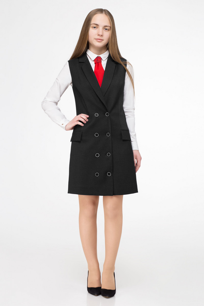 Школьный сарафан для девочки для старшей школьной группы. Сарафан из поливискозной ткани на вискозной подкладки. Сарафан полуприлегающего силуэта, двубортный, со сквозной застежкой по переду на петли и пуговицы. Сарафан с V-образным вырезом горловины, воротник пиджачный с отложными лацканами. По переду и по спинки имеются рельефные швы, которые обеспечивают отличную посадку изделия по фигуре. По переду имеются карманы в рамку с клапанами. Отличный модный вариант для повседневных школьных дней.