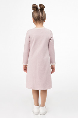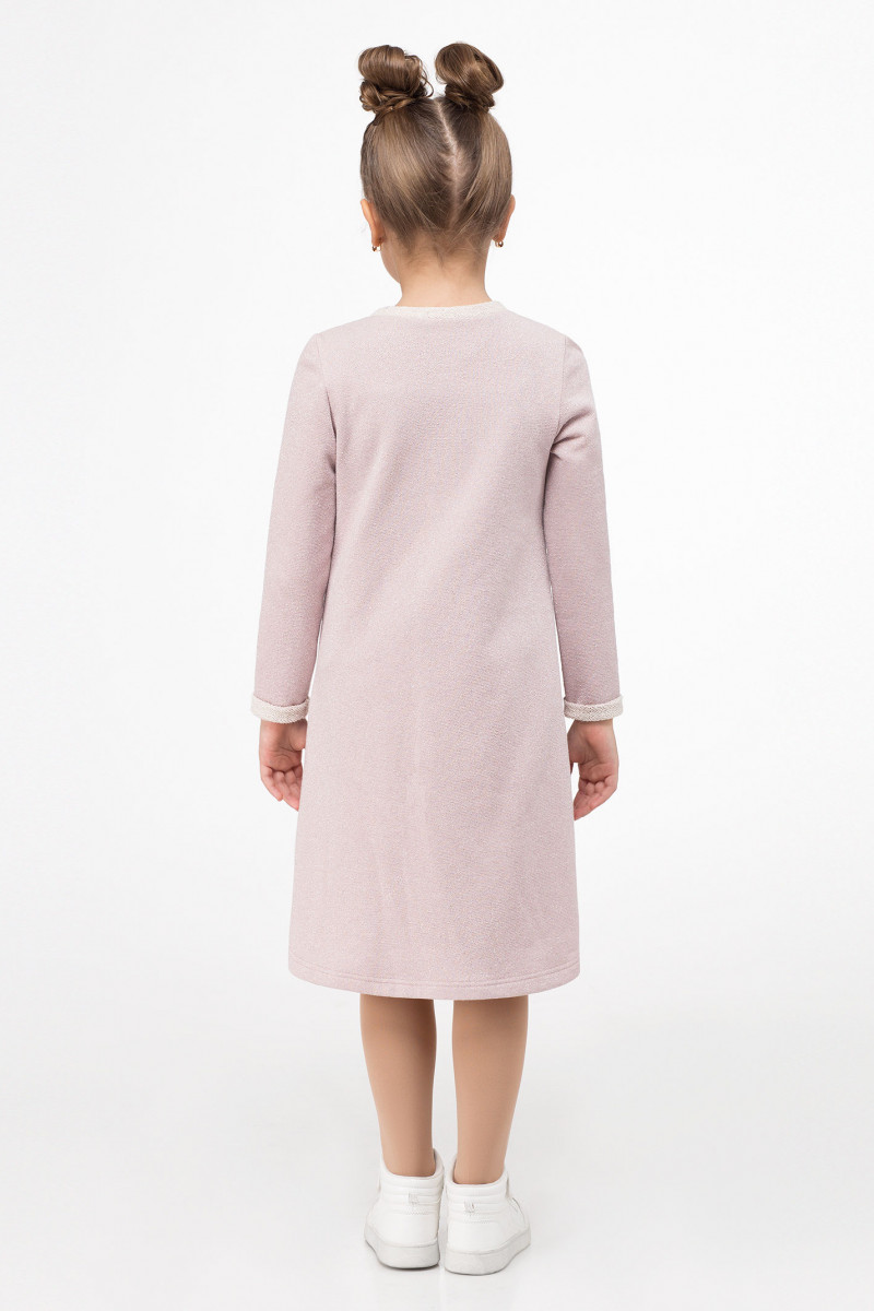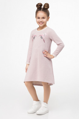 Стильное платье для девочки из трикотажного хлопкового полотна с блеском. Платье расширенного силуэта, с длинными рукавами, с круглым вырезом горловины. По переду платье декорировано яркой вышивкой с пайетками.