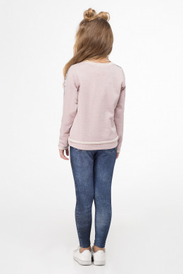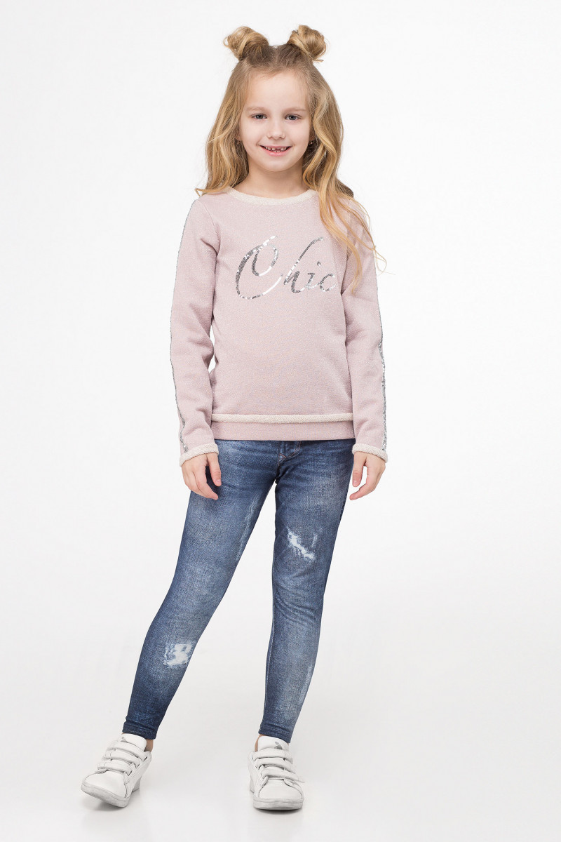 Стильный джемпер для девочки выполнен из хлопкового трикотажного полотна с блеском. Джемпер полуприлегающего силуэта, с длинными рукавами, с круглым вырезом горловины. По переду джемпер декорирован вышивкой пайетками. Джемпер дополнен тесьмой из пайеток по рукаву, что придает джемперу нарядность.