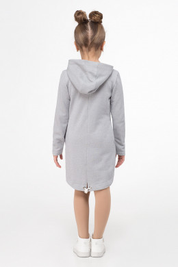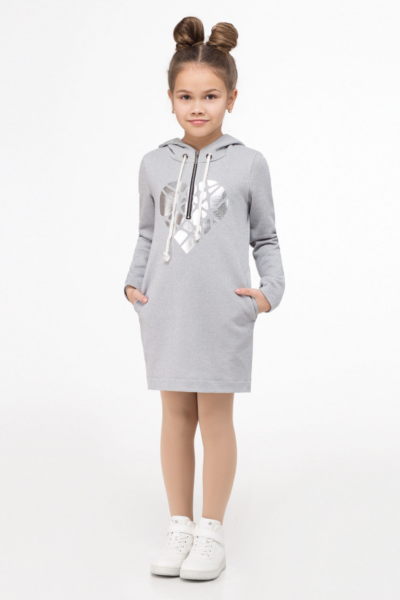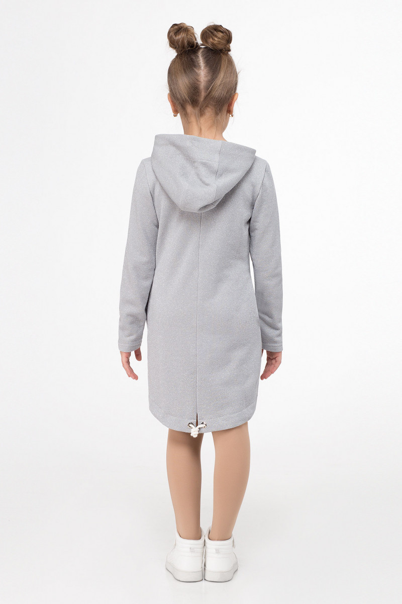 Стильное детское платье из хлопкового трикотажного полотна с блеском в сочетании с отделкой из текстиля с мелким рисунком. Платье свободное, с капюшоном, с декоративной металлической молнией по переду, с карманами в боковых швах. Спинка слегка удлиненная. По переду нанесен рисунок фольгой.