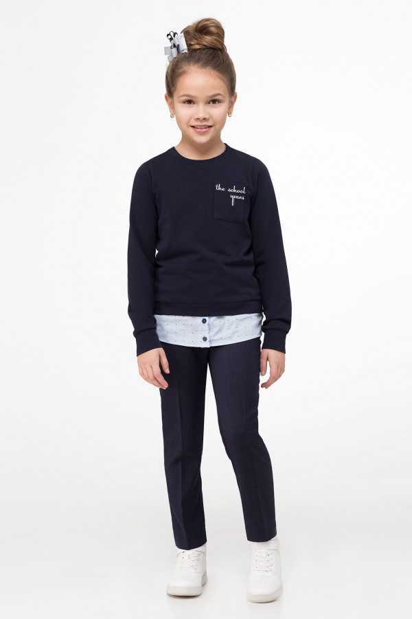 Платье для девочки. Платье выполнено на совмещении трикотажного хлопкового полотна и хлопкового текстиля с мелким рисунком. Комбинация различных видов ткани имитирует комплект, состоящий из джемпера и расширенной в сборку юбки. Платье декорировано по горловине маленьким изящным воротником и рюшей по низу рукавов, застежка по спинке.
