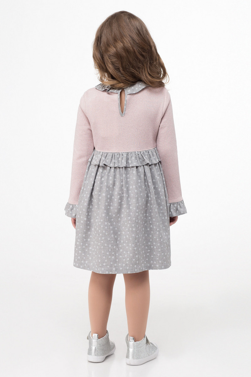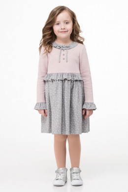 Платье для девочки. Платье выполнено на совмещении трикотажного хлопкового полотна и хлопкового текстиля с мелким рисунком. Комбинация различных видов ткани имитирует комплект, состоящий из джемпера и расширенной в сборку юбки. Платье декорировано по горловине маленьким изящным воротником и рюшей по низу рукавов, застежка по спинке.
