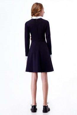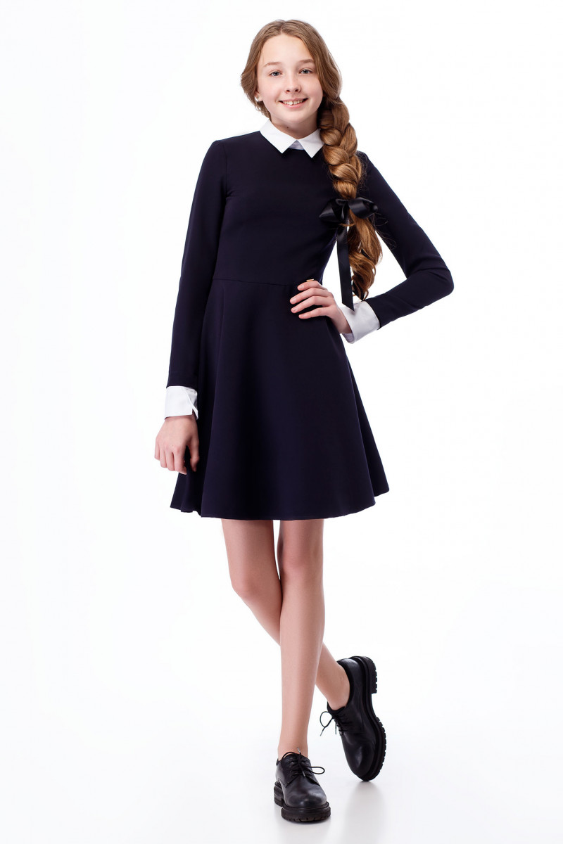 Платье для девочки из струящийся плательной ткани на поливискозной подкладки. Платье отрезное по талии, по преду и по спинки имеются вытачки, с длинными рукавами, с застежкой на потайную тесьму-молнию по спинки. Платье дополнено съёмными манжетами и воротником. Беспроигрышный вариант для школы.