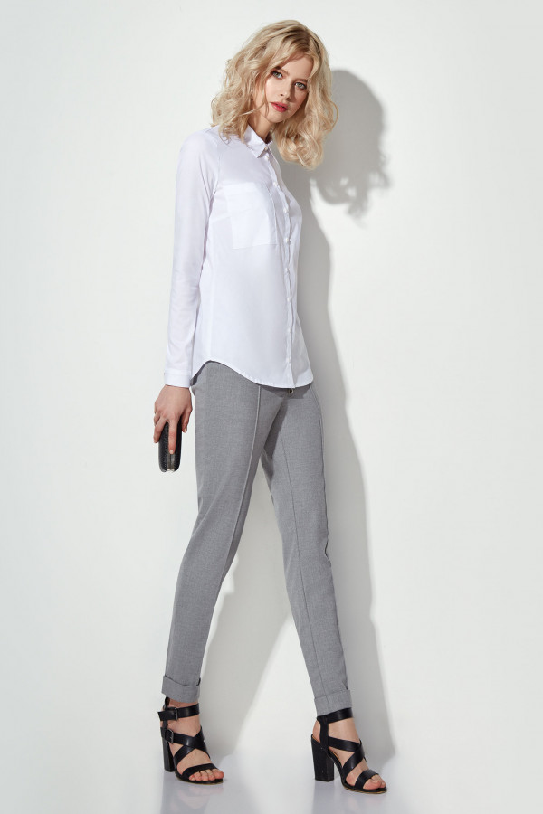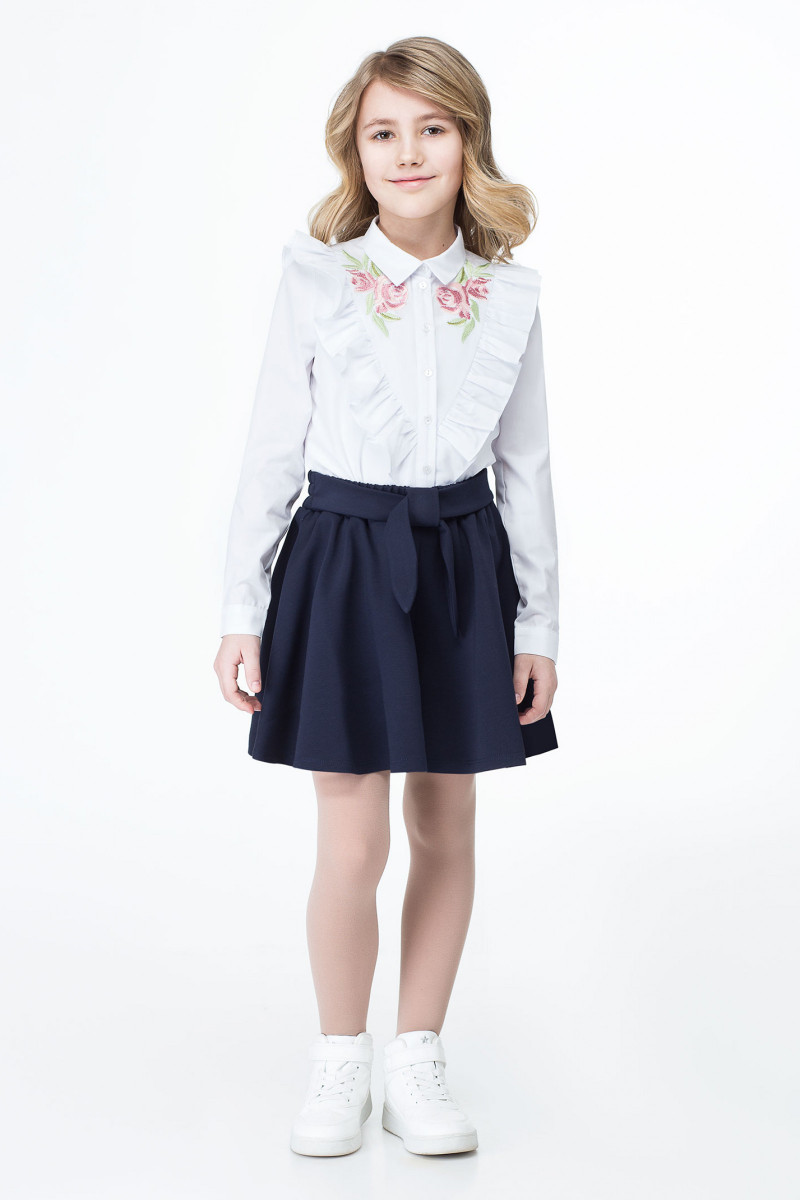 Модная блузка для девочки из смесовой сорочечной ткани. Блузка прямого силуэта, с центральной застежкой на петли и пуговицы и одну петлю и пуговицу на воротнике. По переду и по спинки имеется подрез в который вставлена декоративная рюша. Рукава одношовные с притачными манжетами, застегивающимися на петлю и пуговицу. Разрезы рукавов обработаны окантовкой. Блузка дополнена оригинальной дизайнерской вышивкой по горловине. Такая блузка отлично сочетается с различными юбками и брюками, создавая очень стильный и модный образ ребенка.