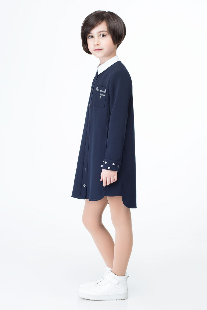 Стильное модное "платье-рубашка" для девочки младшего школьного возраста. Платье со съёмным воротником, что очень практично в уходе. Платье прямого силуэта, с отрезными бочками, с длинными рукавами на притачной манжете, с глубокой складкой по спинки. Платье с центральной сквозной застежкой по переду на петли и пуговицы. В боковых швах имеются карманы. На левой части переда сверху имеется большой накладной карман. Платье дополнено изящной печатью на кармане и декоративными бусинками по манжетам. Очень стильное и модное платье для современной школьницы.