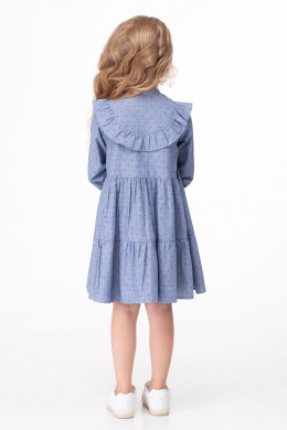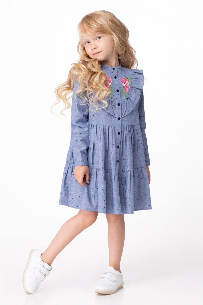 Стильное платье для девочки из хлопковой ткани с рисунком в мелкий горошек. Платье расширенного силуэта, с длинными рукавами, с воротником стойка, с центральной сквозной застежкой на петли и пуговицы. По переду и по спинки имеется фигурная кокетка, в шов подреза вставлена декоративная рюша. По переду на кокетки имеется дизайнерская вышивка цветы, что придает нарядность платью. Комфортное стильное платье подойдет как для повседневных дней, так и для торжественных случаев.