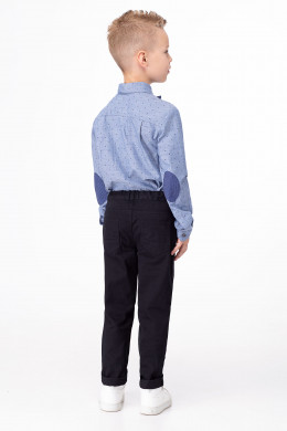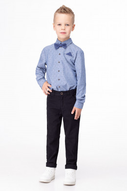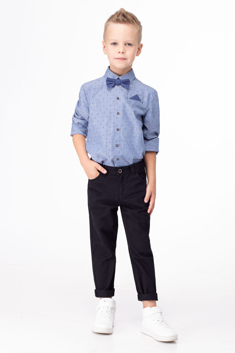 Сорочка для мальчика из хлопковой ткани с рисунком в мелкий горошек. Сорочка прямого силуэта, с центральной застежкой на петли и пуговицы и одну петлю и пуговицу на воротнике. На левой детали переда карман в рамку с декоративным платочком. Спинка с горизонтальной кокеткой и двумя небольшими складочками. Рукава рубашечные одношовные с притачными манжетами, застегивающимися на петлю и пуговицу. Разрезы рукавов обработаны английской планкой. На рукавах имеются декоративные налокотники. Воротник сорочечный. Сорочка дополнена съёмной бабочкой на резинке.