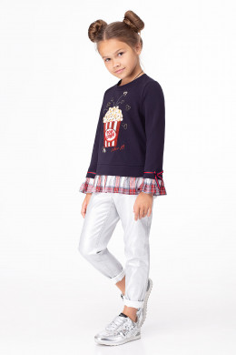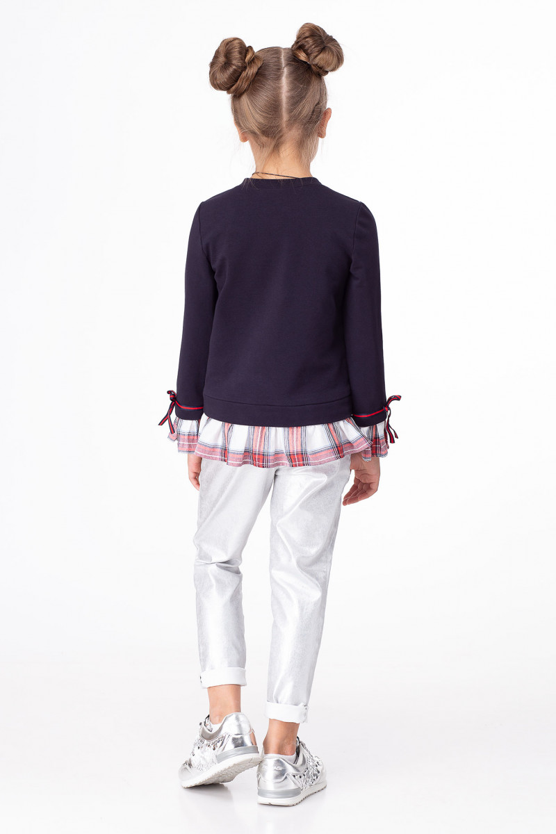 Джемпер для девочки выполнен из хлопкового трикотажного полотна в сочетании с отделкой из текстиля с рисунком в клетку. Джемпер полуприлегающего силуэта, с круглым вырезом горловины, с длинными рукавами. По низу изделия и по низу рукавов рюша из текстиля. По переду имеется яркая стильная молодежная вышивка. Джемпер отлично сочетается с различными брюками и джинсами, создавая модный современный образ вашего ребенка.