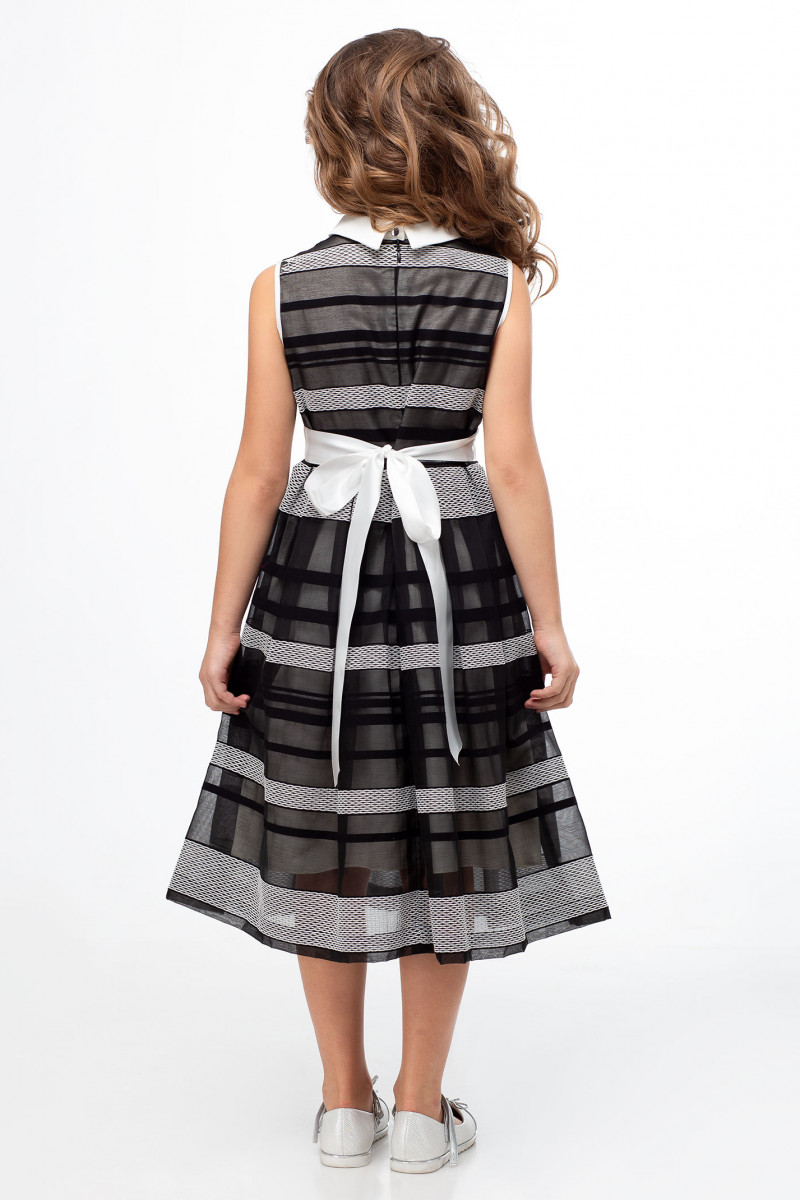 Стильное платье для модной девочки из тонкой органзы с рисунком в полоску. Платье на вискозной подкладки. Платье отрезное по талии, без рукавов, с белым воротником и бантиком по горловине. Застежка на потайную молнию и одну петлю и пуговицу по спинке. По талии атласная лента, которая завязывается в изящный бант по спинке. Отличный модный вариант для стильных современных девчонок.