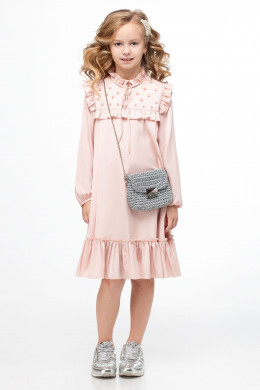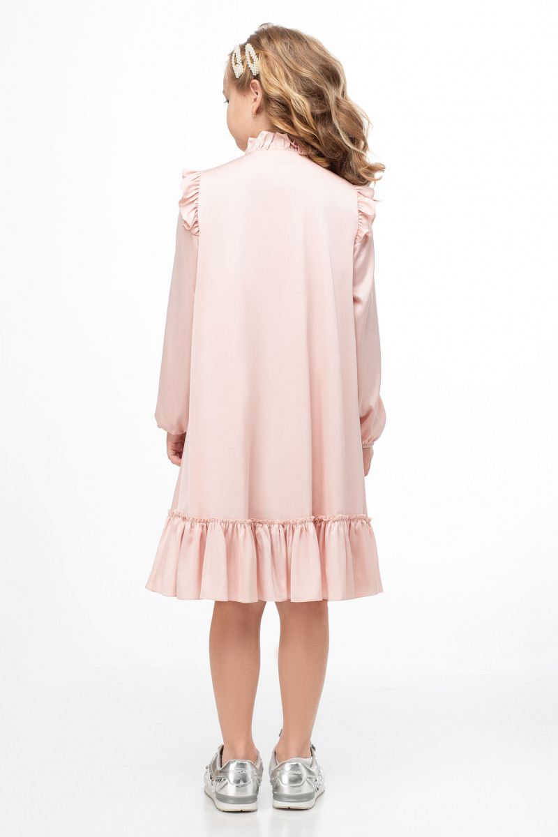 Нарядное платье из тонкой атласной ткани на хлопковой подкладки. Платье расширенного силуэта, с длинными рукавами, с широкой рюшей по низу. По переду кокетка. Кокетка украшена жемчужными бусинками в цвет платья. Платье дополнено рюшами по пройме, кокетке переда и горловине.