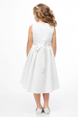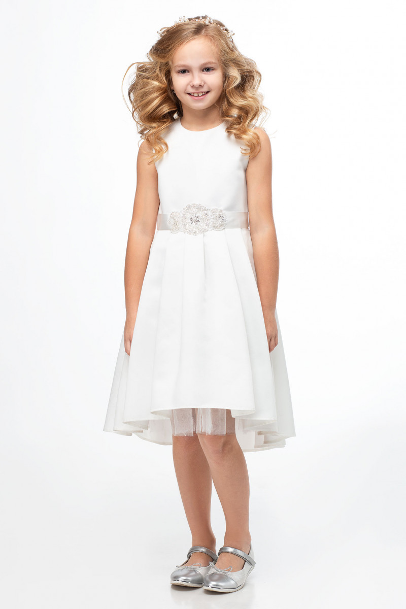 Нарядное платье для девочки из плотной атласной ткани на хлопковой подкладки. Платье отрезное по талии, с круглым вырезом горловины, без рукавов, с удлиненным низом по спинке. Застежка на потайную молнию по талии. По переду по поясу имеется изящный декор из бисера. По талии атласная лента. Платья на хлопковой подкладки.